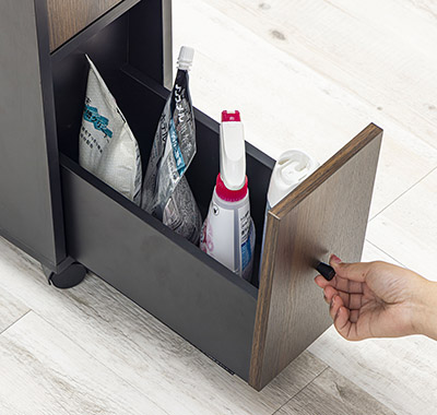 本体はメラミン素材加工&スチールの部分は粉体塗装仕上げで水に強く汚れにも強い仕様でお手入れも簡単です。